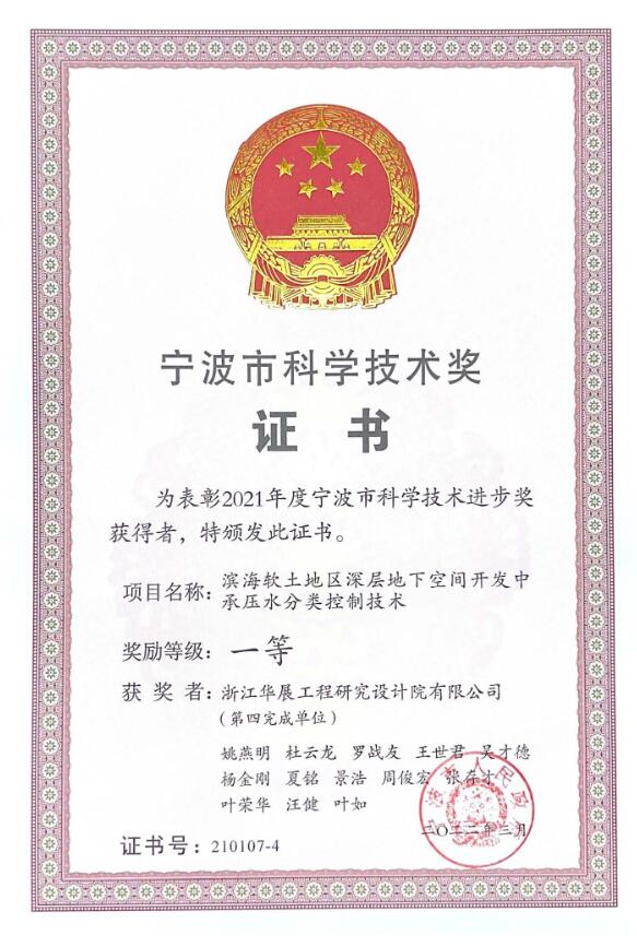 濱海軟土地區(qū)深層地下空間開發(fā)中承壓水分類控制技術(shù)寧波市科學(xué)技術(shù)一等獎